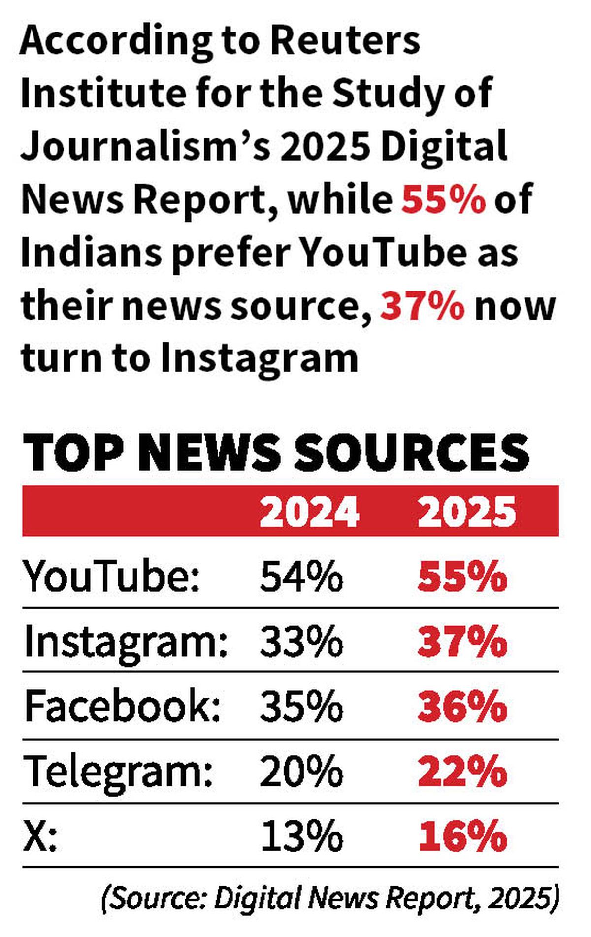 In India, the platform has seen a clear uptick in usage. Reuters Institute for the Study of Journalism’s 2025 Digital News Report captures the scale of this shift: while 55% of Indians preferred YouTube as their news source, 37% now turn to Instagram — the largest rise in news consumption recorded across any platform.